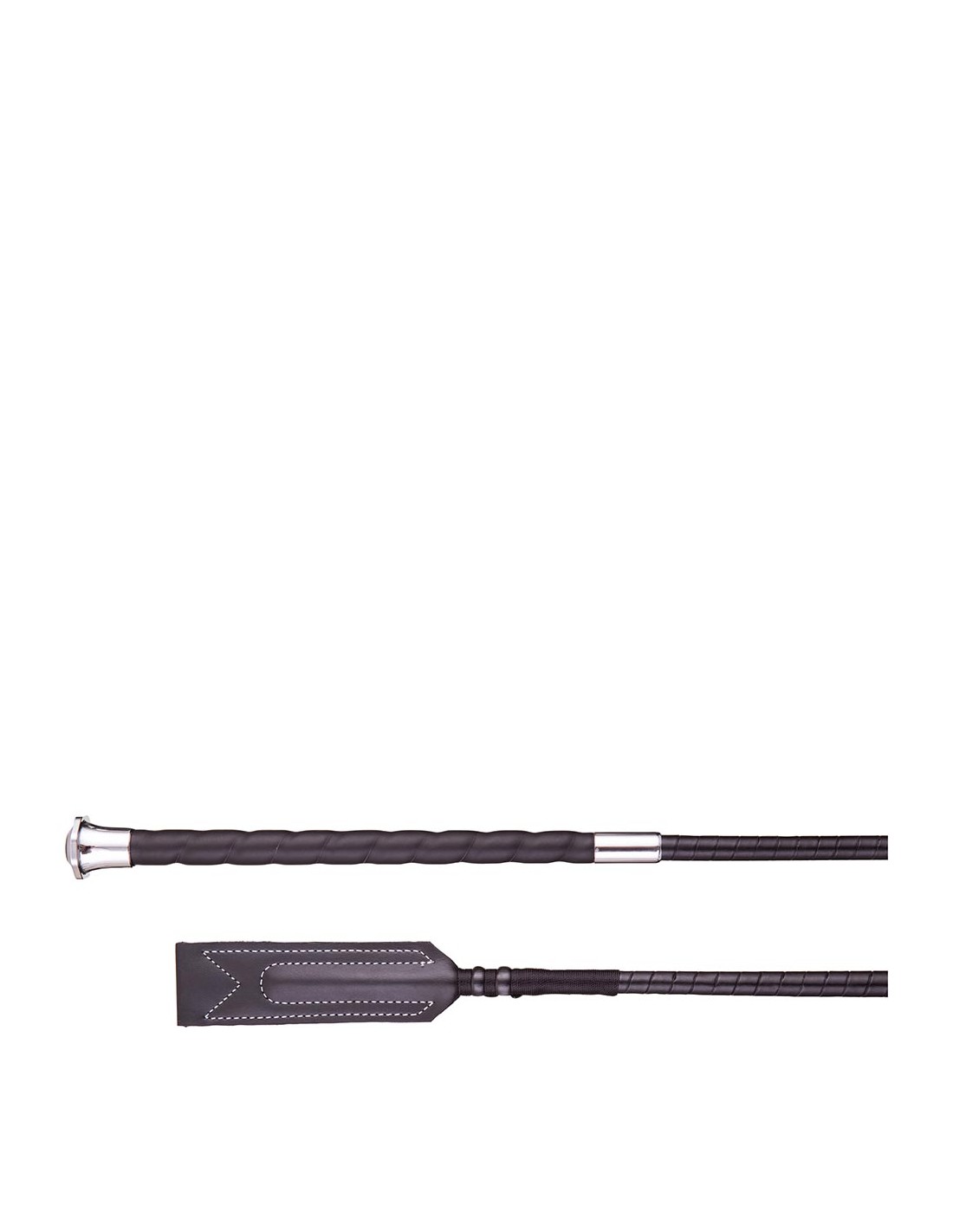 Cravache d’obstacle, tige en fibre de verre, claquette fermée en cuir. La cravache est munie d’une poignée en cuir avec un culot argenté luxueux. Grâce à la poignée forme spirale, la cravache tient bien en main.