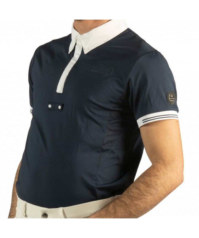 Polo de concours technique, souple, léger, confortable et respirant, il vous sera incontournable pour exceller à cheval en compétition. Côtés en tissu micro perforé ton sur ton pour une évaporation optimale pendant l’effort. Avec son col blanc zippé, judicieusement caché sous la patte, il est simple à fermer. On aime l’élégance du col chemise avec bouton en haut, pour assurer bon maintien pendant l’effort. Passant de cravate. Manches courtes finition bord-côte, à rayures contrastées. Impression caoutchouc silicone sur cœur. Ecusson métallique sur empiècement cuir sur manche gauche. Composition : 95% polyester, 5% spandex.