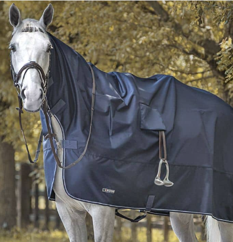 Ouvertures latérales pour les étriers. Tissu imperméable avec cou.