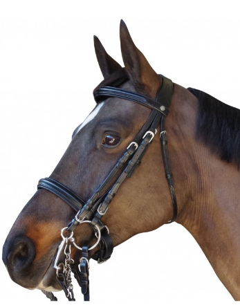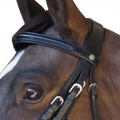 Une muserolle pull back pour une meilleure répartition des points d’appuis pour le confort de votre cheval ! Frontal et muserolle combinée pull back, 1/2 rond et doublées. Têtière anatomique large. Bouclerie carrée laiton.