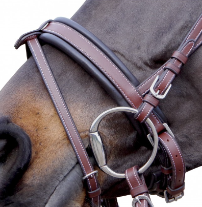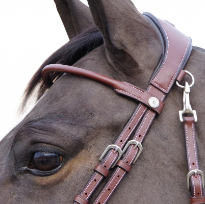 Muserolle Pull Back : une meilleure répartition des points d’appuis pour le confort de votre cheval ! Frontal rond, muserolle pull back plate et dotée d’une large doublure. Têtière anatomique extra large doublée et estampée F&C.