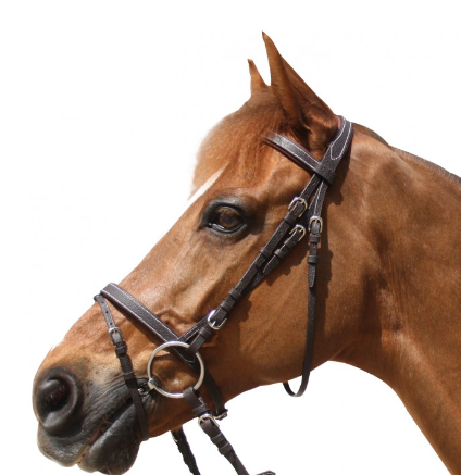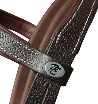 Frontal et muserolle combinée plat doublé, cuir grainé. Têtiere anatomique. Bouclerie lyre nickelée.